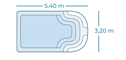 Plongez dans le confort et l’esthétique avec notre mini-piscine coque Annecy, spécialement conçue pour les petits espaces restreints. Avec des dimensions de 5,40 x 3,20 mètres et une profondeur de 1,50 mètre, ce petit bassin s’intègre parfaitement dans les terrains de petite taille. Son design moderne et élégant se fond harmonieusement dans tous les environnements. Facilitez votre entrée dans l’eau grâce aux escaliers intégrés. De plus, le trottoir périphérique de la piscine non seulement renforce la structure de la coque, mais crée également une plage de piscine adjacente, offrant un espace supplémentaire pour profiter pleinement de votre piscine.